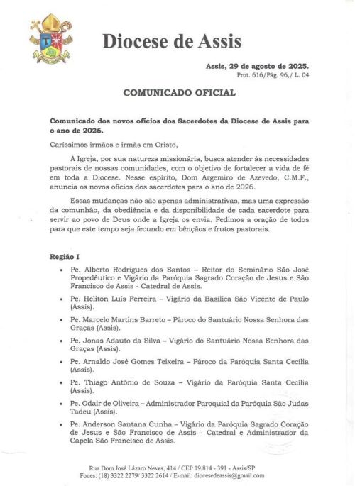 A Diocese de Assis divulgou oficialmente, no dia 29 de agosto, os novos ofícios dos sacerdotes para o ano de 2026, reafirmando o compromisso com a missão pastoral e o atendimento às necessidades das comunidades. O anúncio foi feito por Dom Argemiro de Azevedo, Bispo Diocesano.