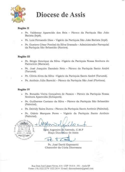 O comunicado foi assinado por Dom Argemiro de Azevedo, Bispo Diocesano de Assis, e Pe. José David Espessotti, Chanceler da Cúria Diocesana.