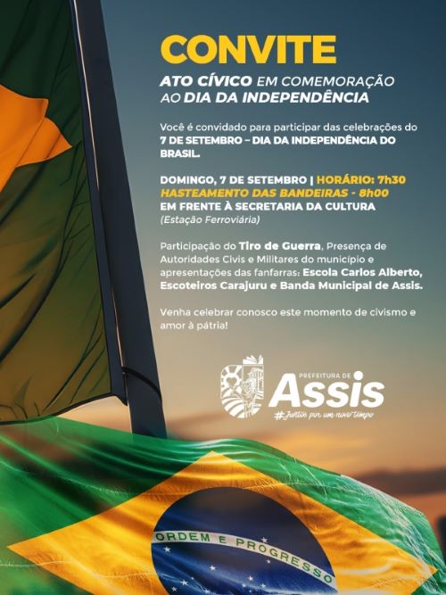 A Prefeitura de Assis convida toda a população para um momento especial de civismo, união e amor à pátria. No próximo domingo, 7 de setembro, a cidade se reunirá para celebrar o Dia da Independência do Brasil, em uma cerimônia marcada por emoção e respeito à história nacional.