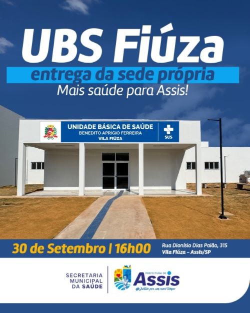 A Prefeitura de Assis, por meio da Secretaria Municipal da Saúde, entrega nesta terça-feira, 30 de setembro, às 16h, a sede própria da Unidade Básica de Saúde Benedito Aprigio Ferreira, Vila Fiuza, localizada na Rua Dionísio Dias Paião, nº 315.