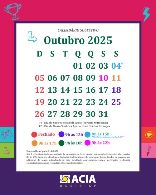 O comércio de Assis já definiu os horários especiais de funcionamento para o mês de outubro. A programação inclui ajustes devido ao feriado municipal do padroeiro da cidade, São Francisco de Assis, além da data comemorativa do Dia das Crianças.