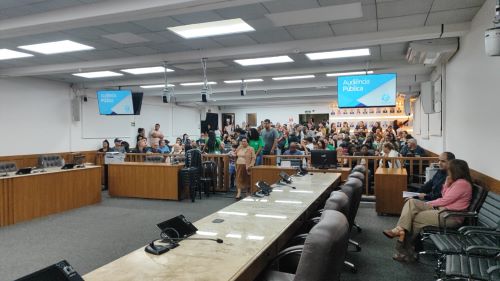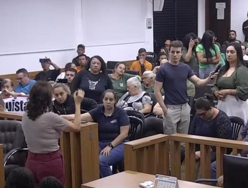 Após a reunião, um grupo de pais e professores se dirigiu à Câmara Municipal, onde ocorria audiência pública sobre o Plano Plurianual (PPA). Munidos de cartazes, cobraram explicações da Prefeitura.