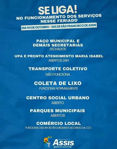A Prefeitura de Assis informa como ficará o funcionamento dos serviços durante o feriado: