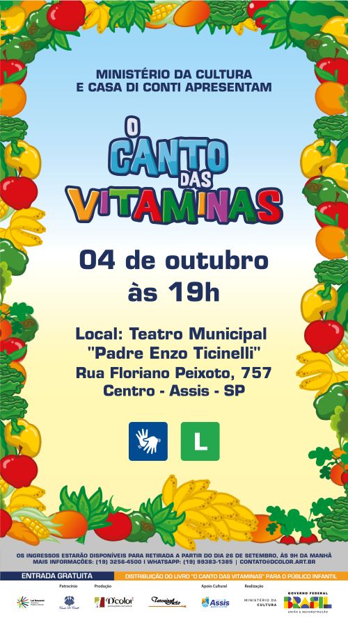 O espetáculo infantil O Canto das Vitaminas apresentado nesta sexta-feira, 3, com sessões exclusivas para alunos de Assis e Cândido Mota, no Teatro Municipal Padre Enzo Ticinelli fará neste sábado, 4, uma terceira sessão, aberta ao público, às 19h. A peça traz as peripécias de uma garota que descobre o quão colorido é o mundo dos alimentos. Todas as sessões serão realizadas no Teatro Municipal Padre Enzo Ticinelli.