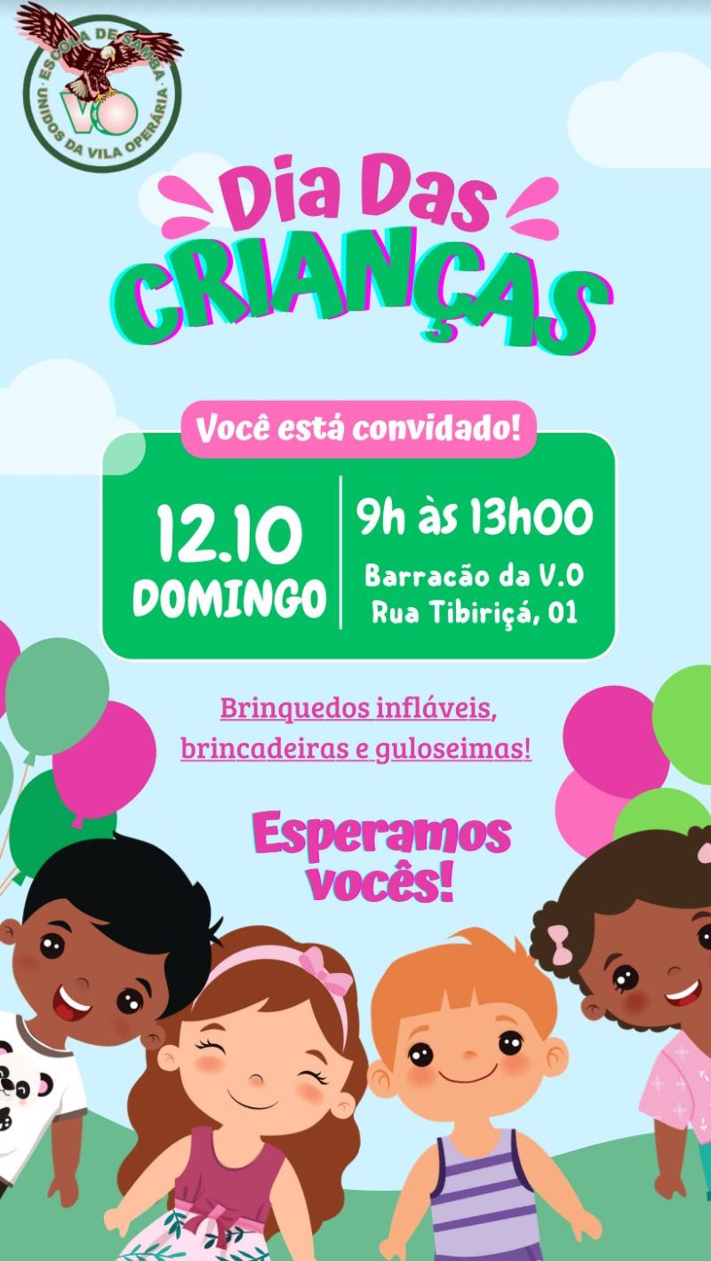 A Escola de Samba da Vila Operária preparou uma manhã repleta de alegria para celebrar o Dia das Crianças, neste domingo, 12 de outubro, das 9h às 13h, no Barracão da V.O, localizado na Rua Tibiriçá, nº 01.