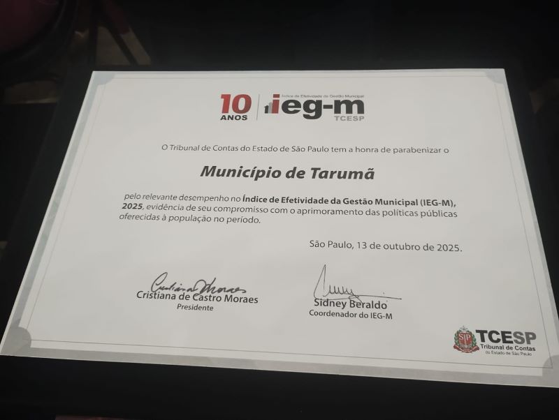 Nesta segunda-feira, 13, a Prefeitura de Tarumã foi homenageada pelo Tribunal de Contas do Estado de São Paulo (TCE-SP) durante a solenidade que celebrou os 10 anos de implantação do Índice de Efetividade da Gestão Municipal (IEG-M), criado em 2015. O evento contou com a presença de diversas autoridades, entre elas o Conselheiro Sidney Beraldo, presidente à época da criação do índice, a atual presidente do TCE-SP, Cristiana de Castro Moraes, o presidente da Assembleia Legislativa André do Prado, e o governador do Estado, Tarcísio de Freitas, que realizou a entrega da premiação.