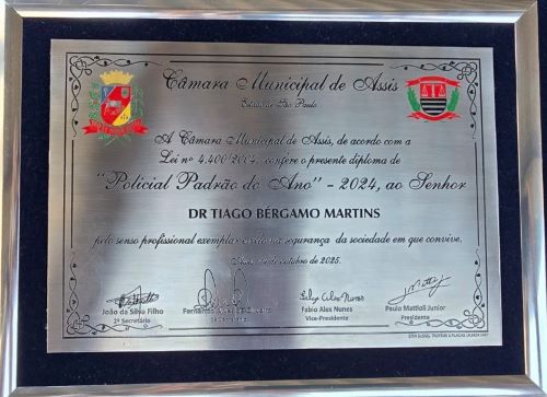 Em sessão solene realizada na Câmara Municipal de Assis/SP, no dia 14 de outubro de 2025, o Delegado de Polícia da DIG/DISE de Assis, Dr. Tiago Bergamo Martins, foi homenageado com o título de Policial Padrão do ano de 2024.