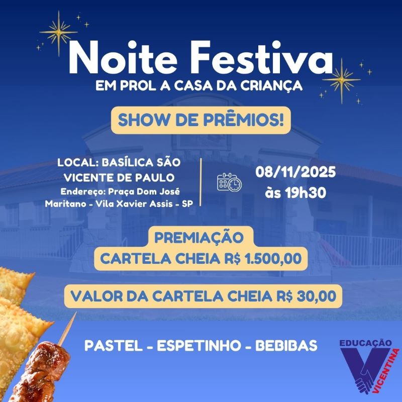 A Casa da Criança Dom Antônio José dos Santos fará no dia 8 de novembro, a partir das 19h30, sua 1ª Noite Festiva "Show de Prêmios", Beneficente, na Basílica São Vicente de Paulo, em Assis.