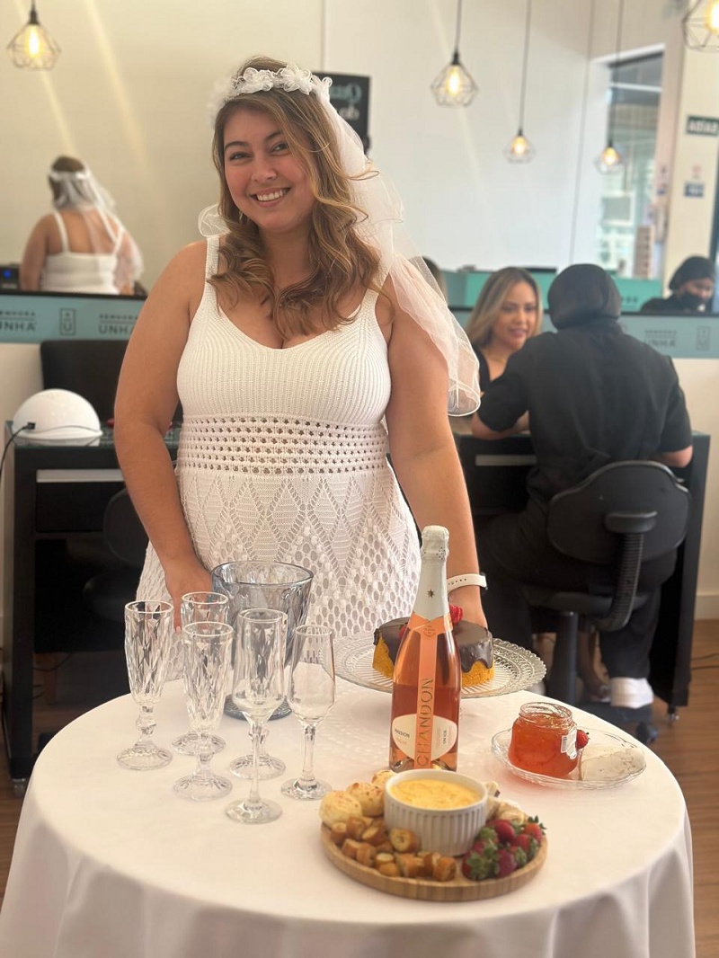 Entre risadas, cuidados e muito carinho da equipe, Daniela aproveitou um ambiente de relaxamento e alegria, enquanto recebia um tratamento completo de noiva: unhas impecáveis e o privilégio de uma mesa repleta de guloseimas e champanhe para brindar o grande momento.
