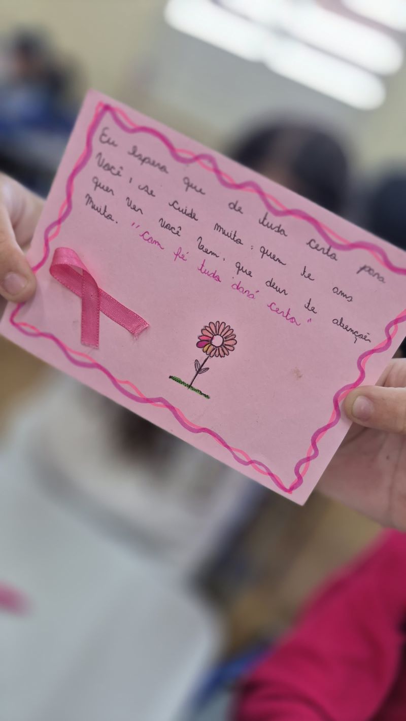 Em seguida, todas as turmas participaram de formações em sala de aula, onde os alunos aprenderam sobre a importância da prevenção e do autocuidado. Como forma de multiplicar esse conhecimento, os estudantes receberam lacinhos rosas e informativos sobre o câncer de mama, que foram entregues às famílias, levando informação e carinho para dentro de casa.