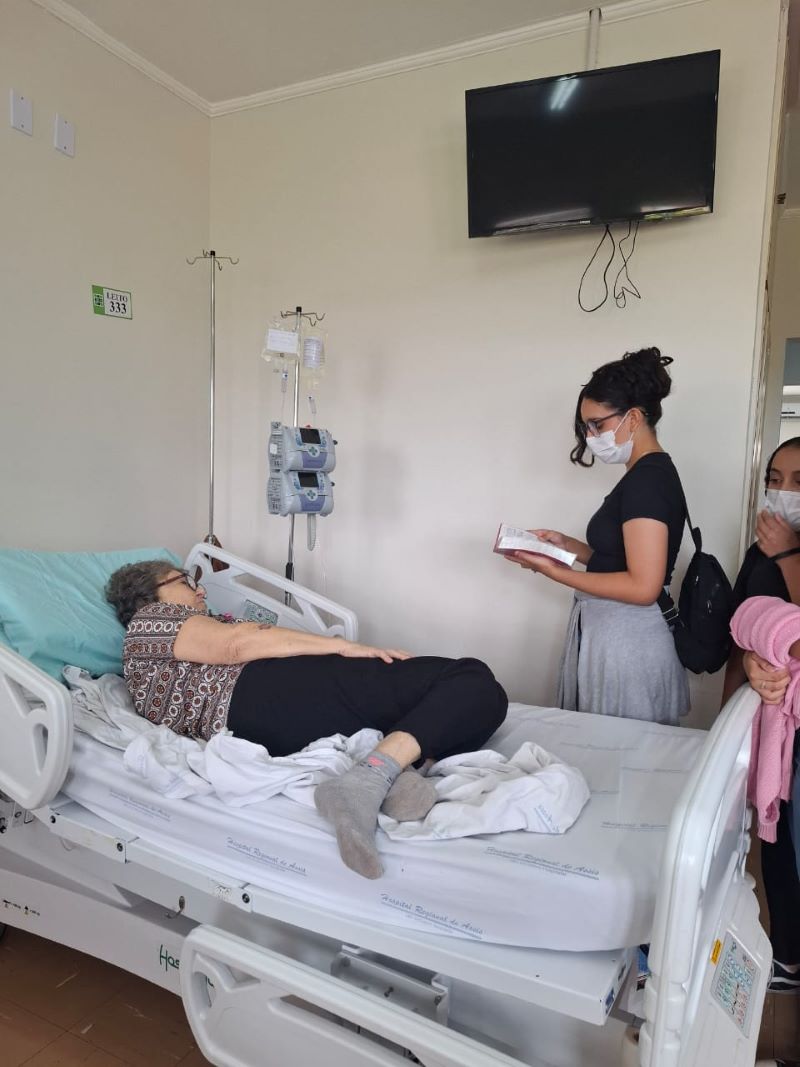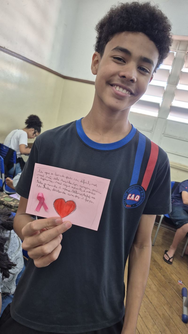 Para encerrar as ações com um gesto de amor, os alunos do 8º ano A prepararam cartões escritos com muito carinho, entregues pessoalmente aos pacientes da oncologia do Hospital Regional de Assis.