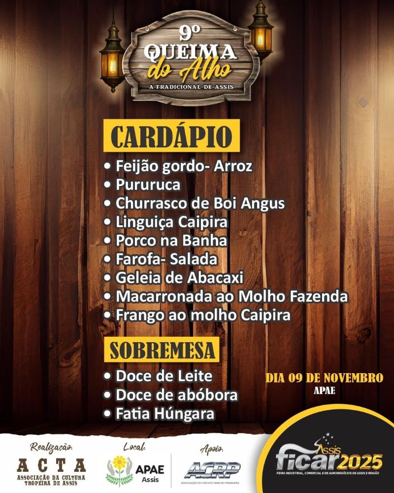 Confira o cardápio da 9ª Queima do Alho que será realizada neste domingo, 9