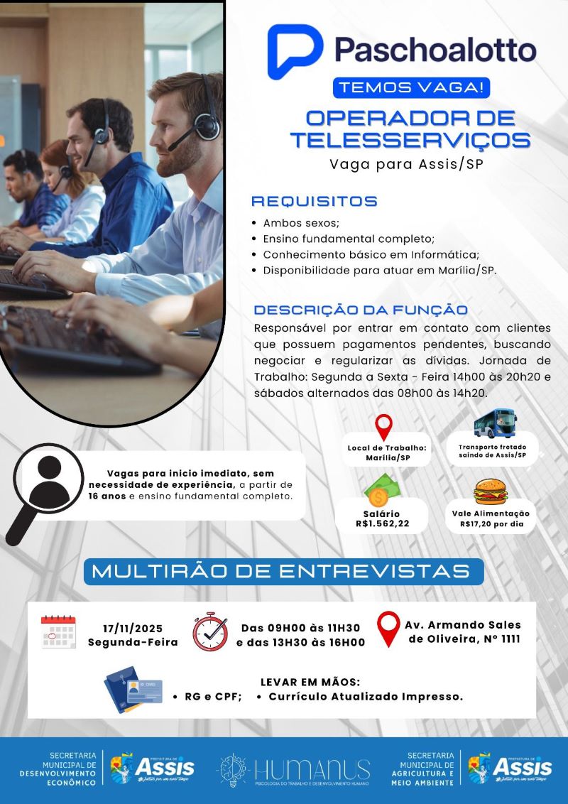 A Prefeitura de Assis, por meio da Secretaria Municipal de Desenvolvimento Econômico/PAT e da Secretaria de Agricultura e Meio Ambiente, em parceria com a empresa Paschoalotto, fará no dia 17 de novembro (segunda-feira) um Mutirão de Entrevistas para contratação de operadores de telesserviços.