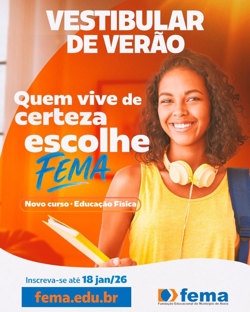 Estão abertas as inscrições para o Vestibular de Verão 2026 da Fundação Educacional do Município de Assis (FEMA). O processo seletivo é gratuito, totalmente online e segue com inscrições abertas até o dia 18 de janeiro de 2026.
