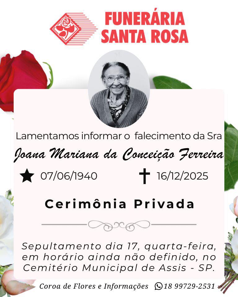 No período da tarde, às 16 horas, será sepultada Joana Mariana da Conceição Ferreira, de 85 anos, que está sendo velada na própria residência.