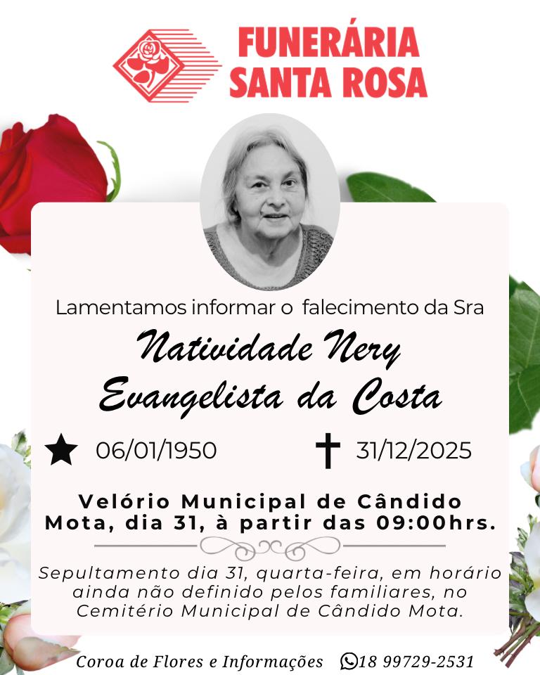 Região - Em Cândido Mota, será sepultada Natividade de Nery Evangelista da Costa, de 75 anos.