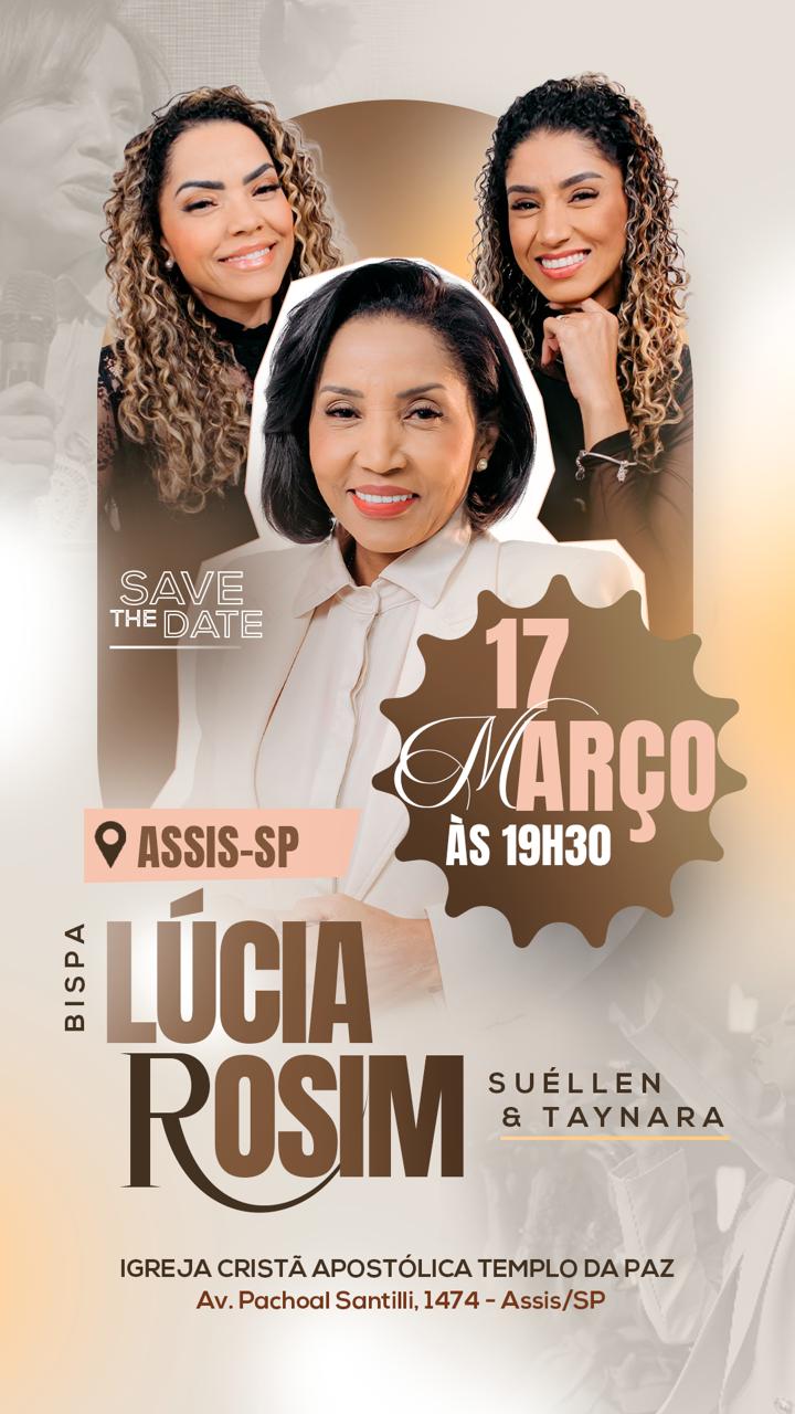 A Igreja Cristã Apostólica Templo da Paz, em Assis (SP), realizará no dia 17 de março, às 19h30, o encontro especial “Conexão Feminina”, lcontando com a participação da bispa Lúcia Rosim. Segundo a organização informou ao portal Abordagem Notícias, a proposta é promover um momento de fé, reflexão e fortalecimento espiritual voltado ao público feminino.