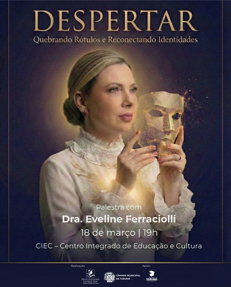 A Câmara Municipal de Tarumã, por meio da Procuradoria da Mulher, realiza no dia 18 de março, às 19h, no CIEC, a palestra “Despertar – Quebrando Rótulos e Reconectando Identidades”, com a Dra. Eveline Ferraciolli.