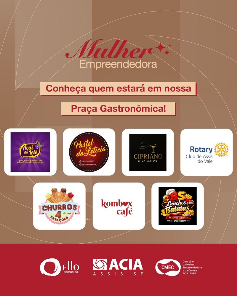 A Praça Gastronômica será uma das atrações do Evento Mulher Empreendedora, que acontece no dia 17 de março, das 18h às 22h, no Salão de Eventos da ACIA, em Assis. O espaço foi planejado para oferecer diversidade de sabores ao público durante toda a programação.