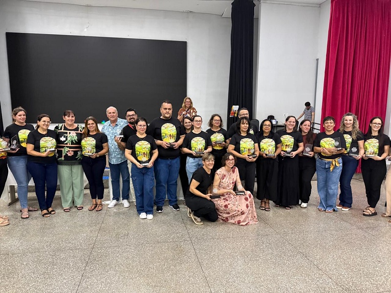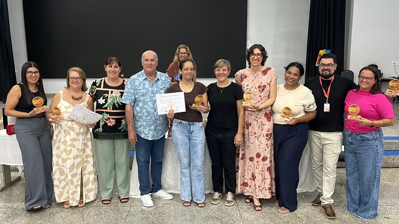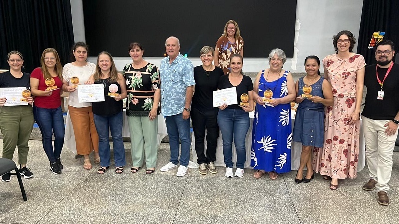 Durante o evento, professores e equipes escolares foram homenageados com a entrega de troféus, em reconhecimento ao trabalho desenvolvido nas salas de aula.