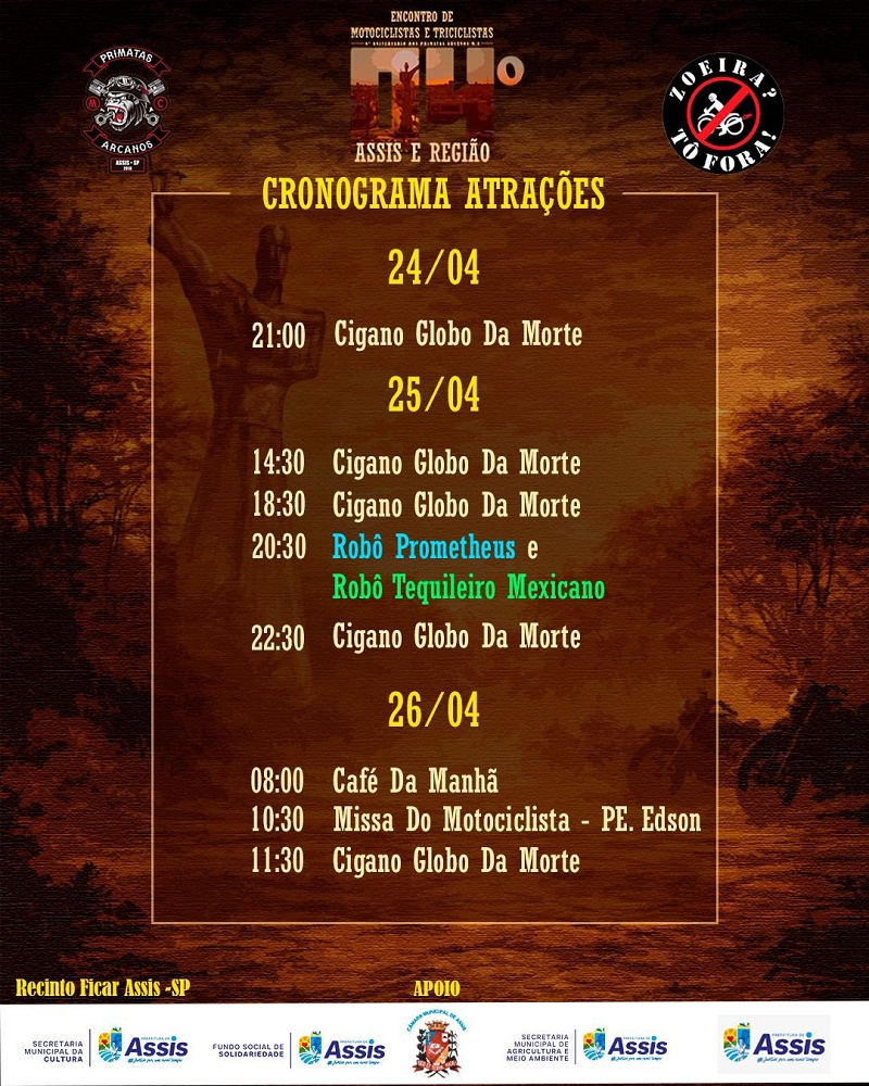 O encontro segue neste domingo (26), com café da manhã às 8h, Missa do Motociclista às 10h30, celebrada pelo padre Edson, e nova apresentação do Globo da Morte às 11h30.