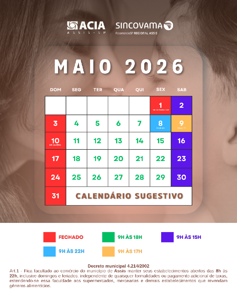 A Associação Comercial e Industrial de Assis (ACIA) divulgou o calendário sugestivo de funcionamento do comércio para o mês de maio de 2026, com destaque para o horário especial em uma das datas mais importantes para o varejo: o Dia das Mães.